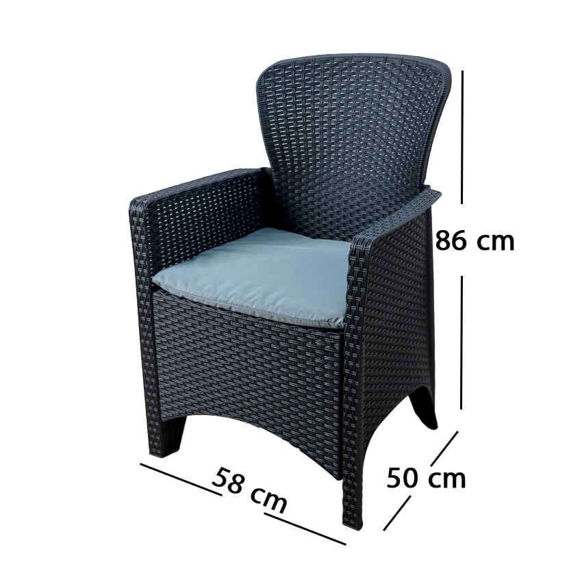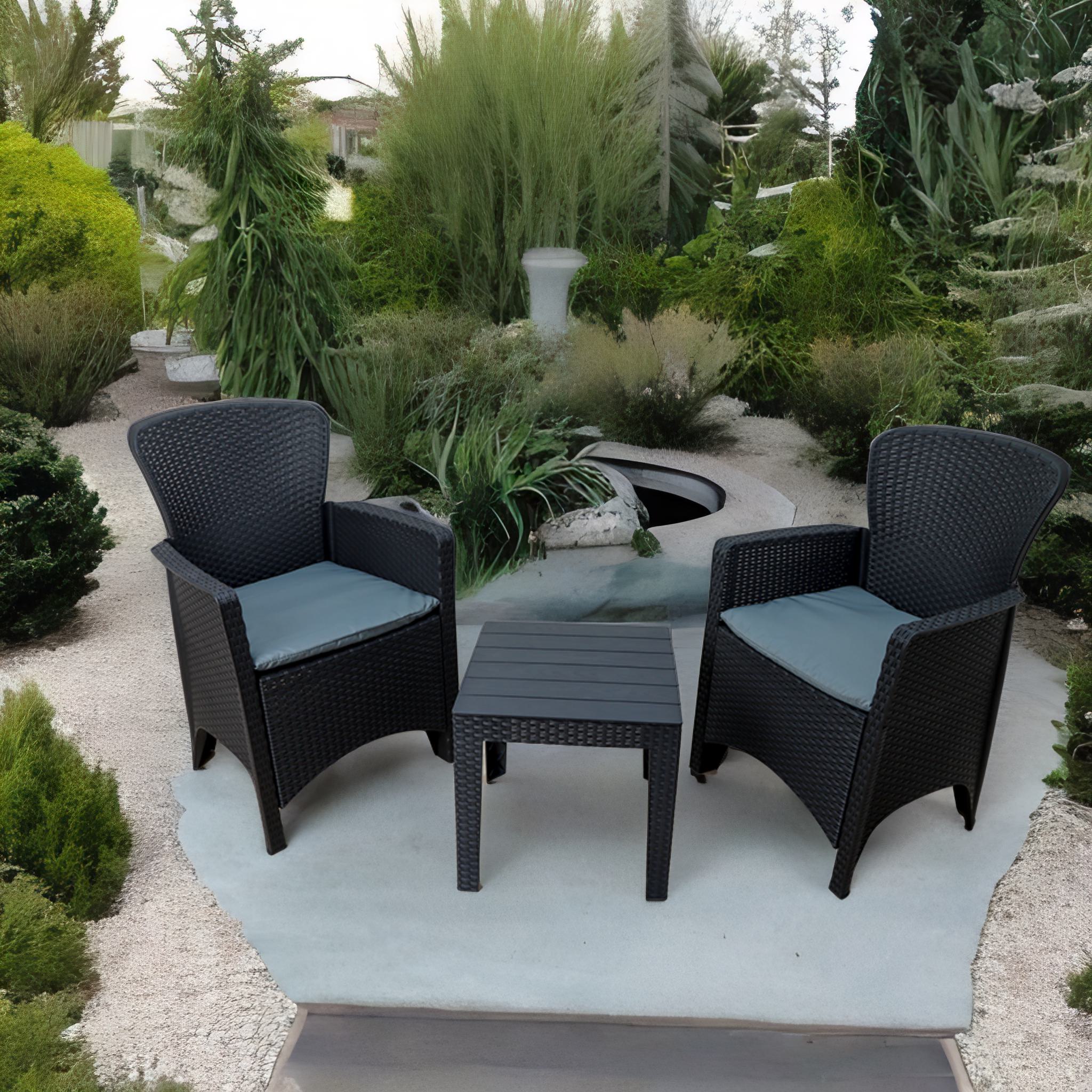 طقم جلسة خارجية مكونة من كراسي بمقاعد جلوس مريحة ومسند ظهر ثابت مع طاولة جانبية , مناسبة لحديقة المنزل والمساحات الخارجية الواسعة , تمتاز بالجودة والمتانة حيث لها القدرة على تحمل الأجواء الخارجية المتقلبة والممطرة , كما أنها سهلة الحمل وسهلة التنظيف , تعتبر من الجلسات الرائعة التي تجمع الأشخاص للجلوس والدردشة وتناول المشروبات والإستمتاع بالأجواء الجميلة .