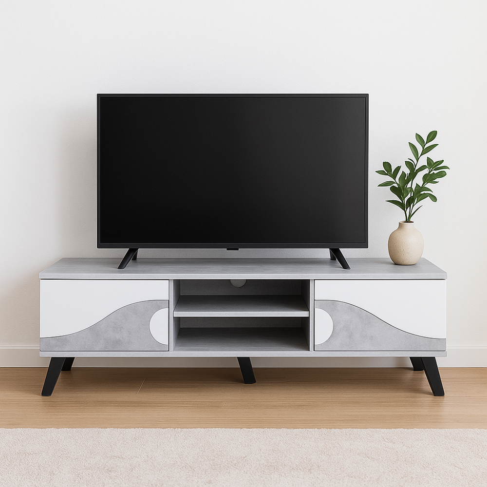 طاولة تلفزيون من خشب ماليزي عالي الجودة، تصميم أنيق باللون الرمادي الفاتح والأبيض، مزودة بأدراج وأرفف لتخزين مثالي. قاعدة قوية وثابتة تضمن ثبات الطاولة، مثالية لغرف المعيشة والمجالس وغرف الضيوف.