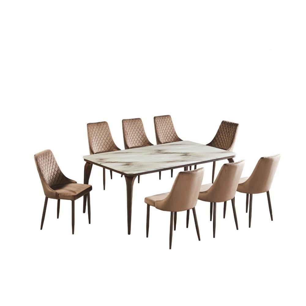طاولة طعام رخامية 8 مقاعد مخمل أنيقة - لون بني