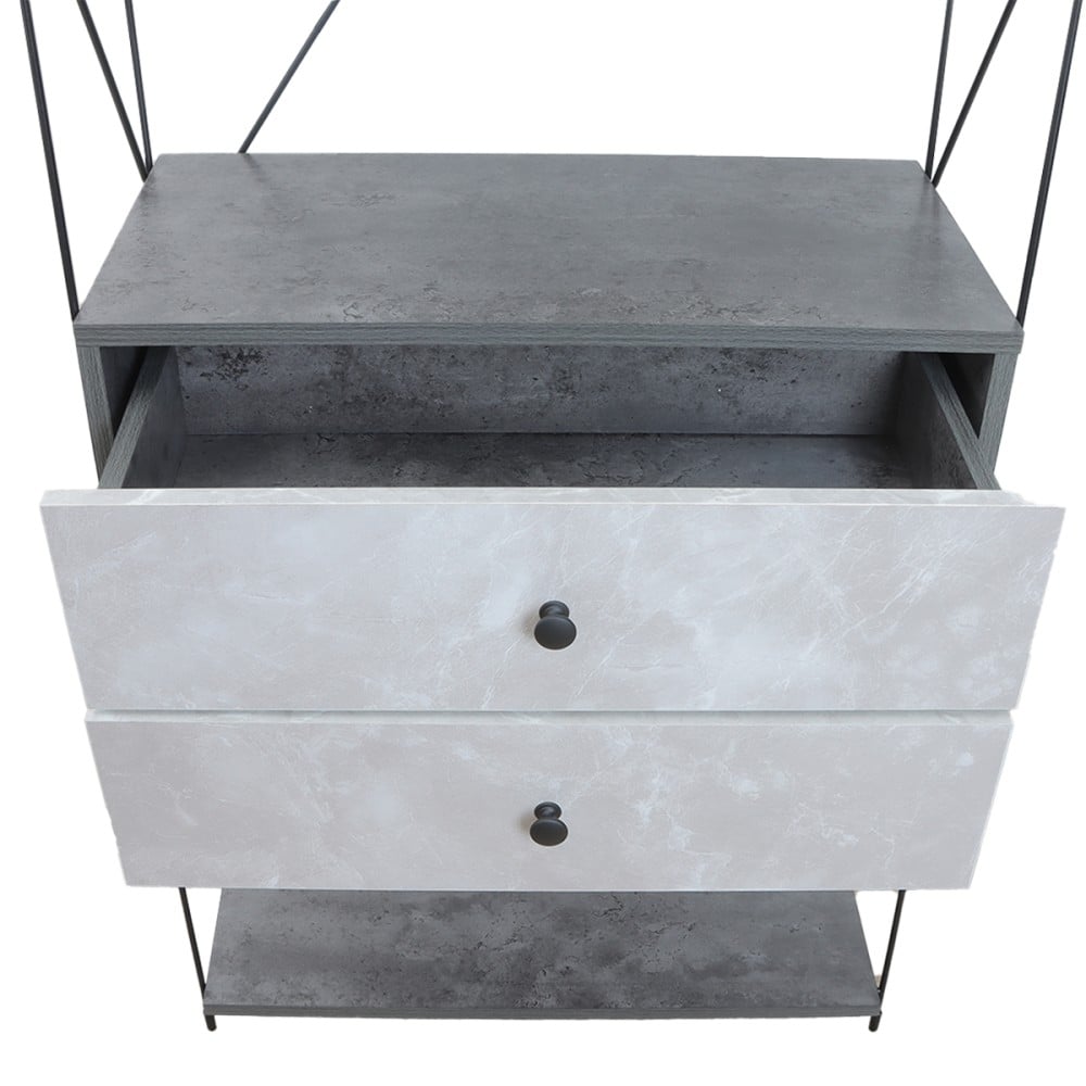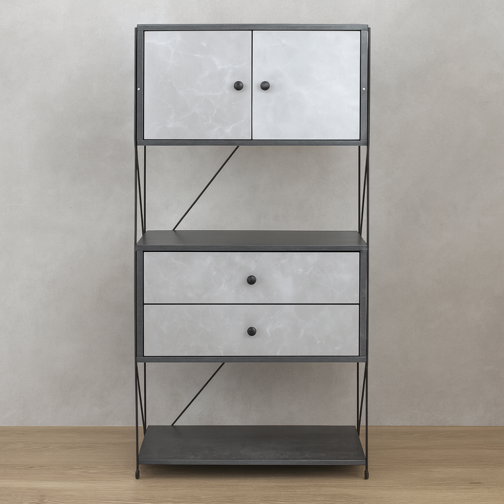 وحدة أرفف خشبية 4 أدوار مع أدراج وخزانة للتنظيم – تصميم عصري بلون رخامي وقاعدة متينة من خشب ماليزي