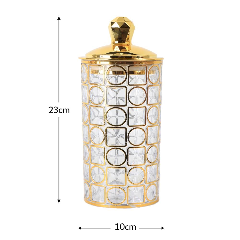 علبة تخزين أنيقة مصنوعة من الأكريليك الشفاف، مثالية لحفظ السكر أو الشاي مع الحفاظ على شكلها العصري. تتميز بشكل شفاف يتيح رؤية المحتويات بسهولة، متعددة الإستخدامات ,ما يجعلها إضافة رائعة لأي مطبخ أو طاولة. الغطاء الذهبي المصقول يضفي لمسة فاخرة ومميزة، مع تصميم دائري ناعم يضمن الإغلاق المحكم والحفاظ على الطعم .